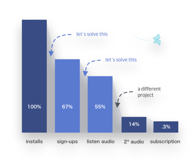 On average, only 67% of the users downloading Pausa end up signing up. Furthermore, only 55% of the users start listening to our 7-day meditation program, which we consider key to make them feel happy with Pausa and end up subscribing.