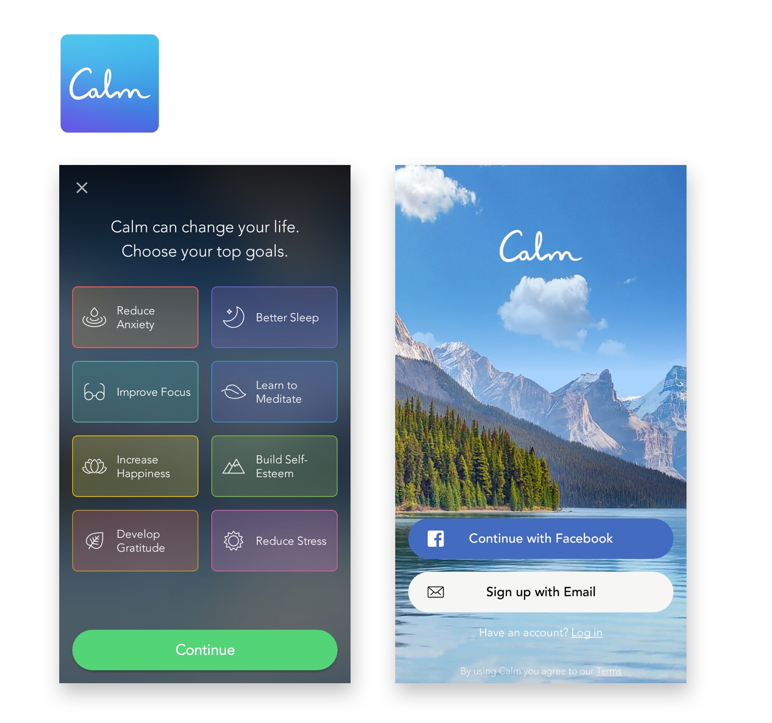 Calm even goes beyond. The hook here is to ask users what goals they want to achieve, right from the very beginning. As a user, there is no possibility I wouldn´t at least sign up. Fantastic idea.