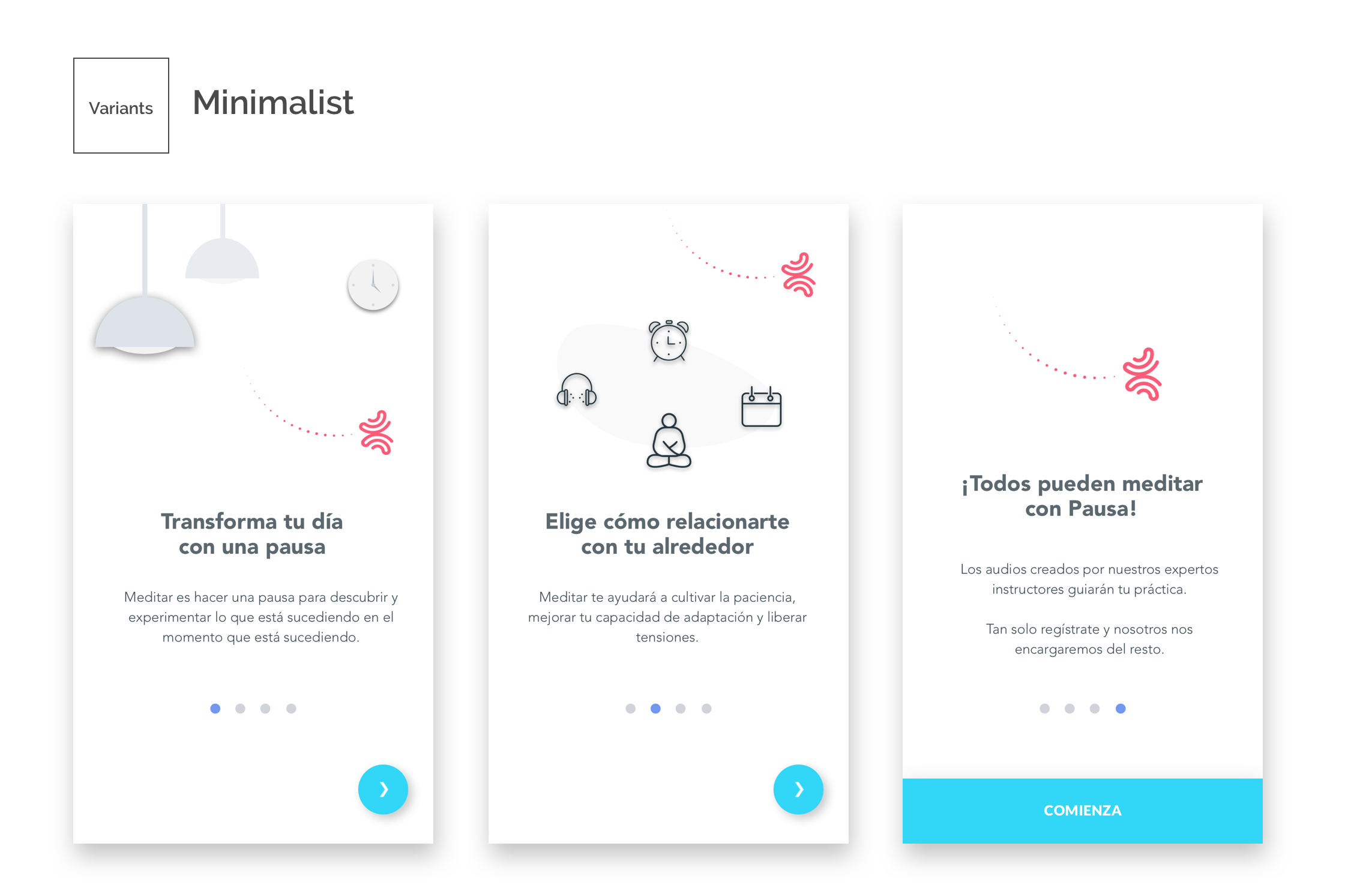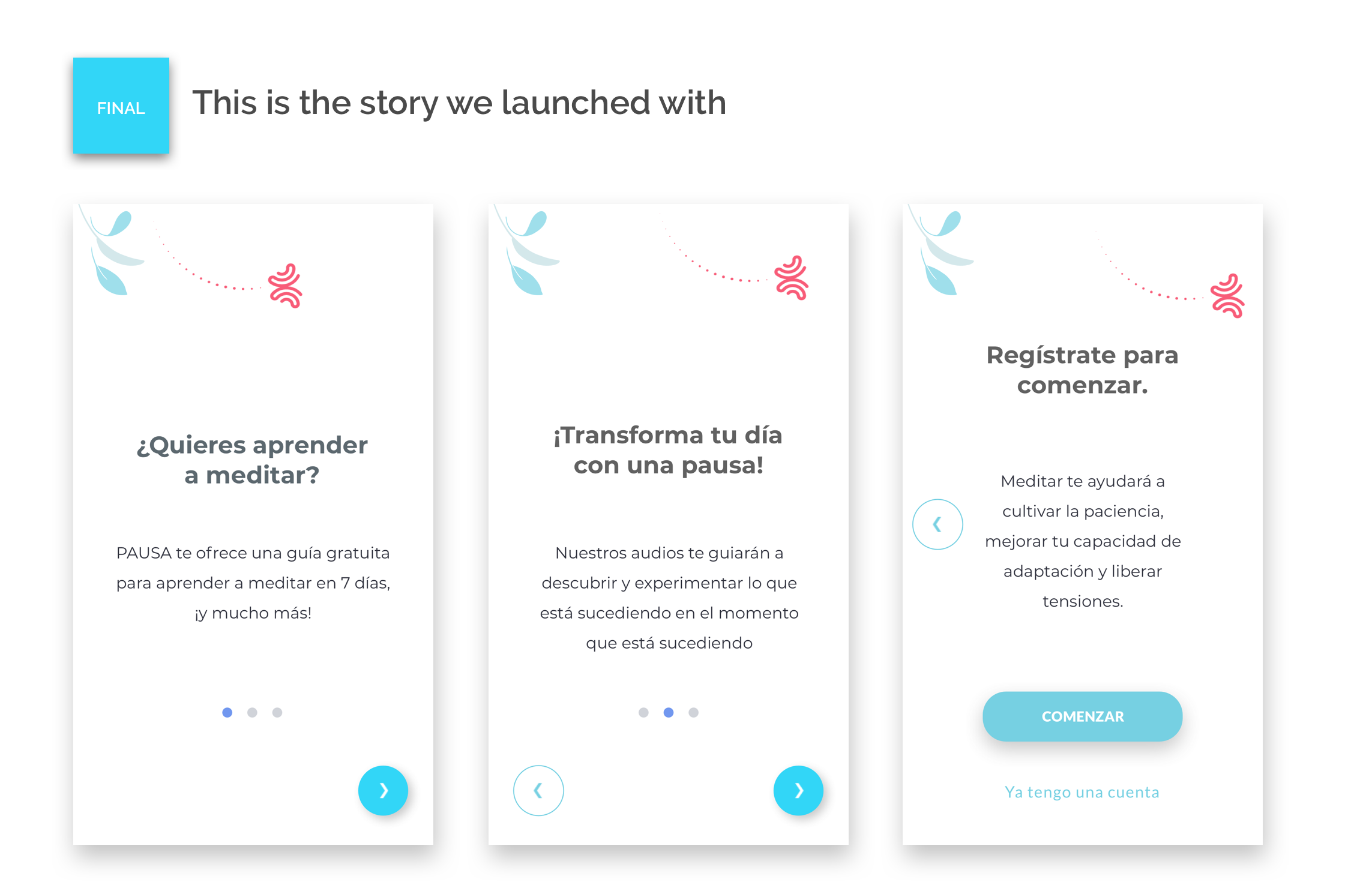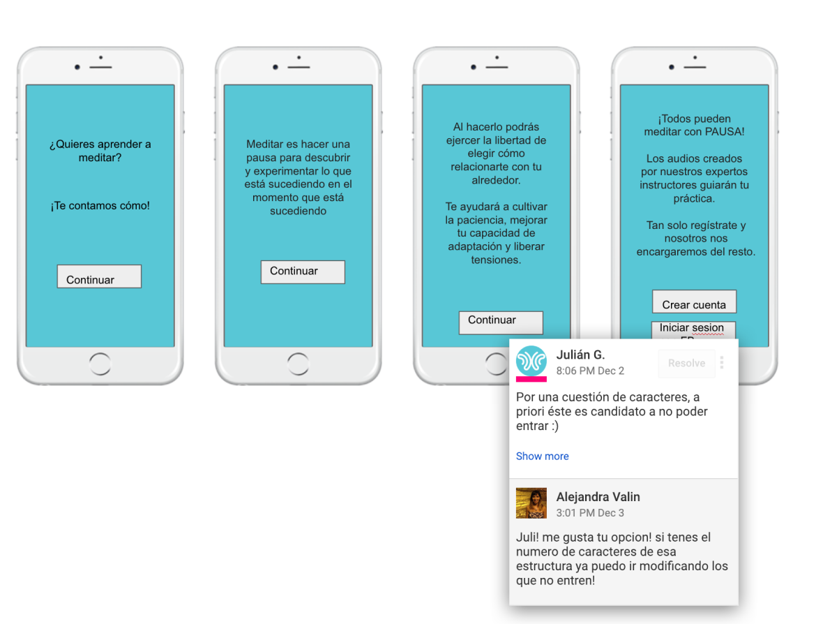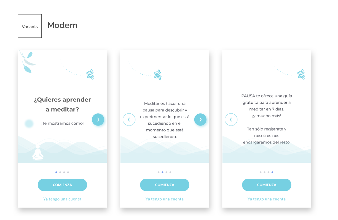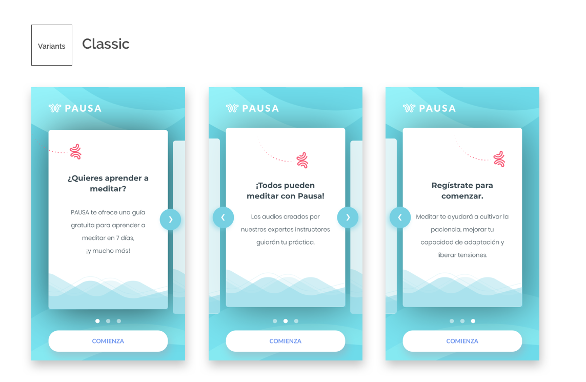 One of our team members took the lead to define what key messages we would be showing to our users, with two main goals in mind: a) To provide them with an overall understanding on how to use Pausa; b) To guide them to what we considered was the best way to start the journey with Pausa: Our 7-day program for beginners.